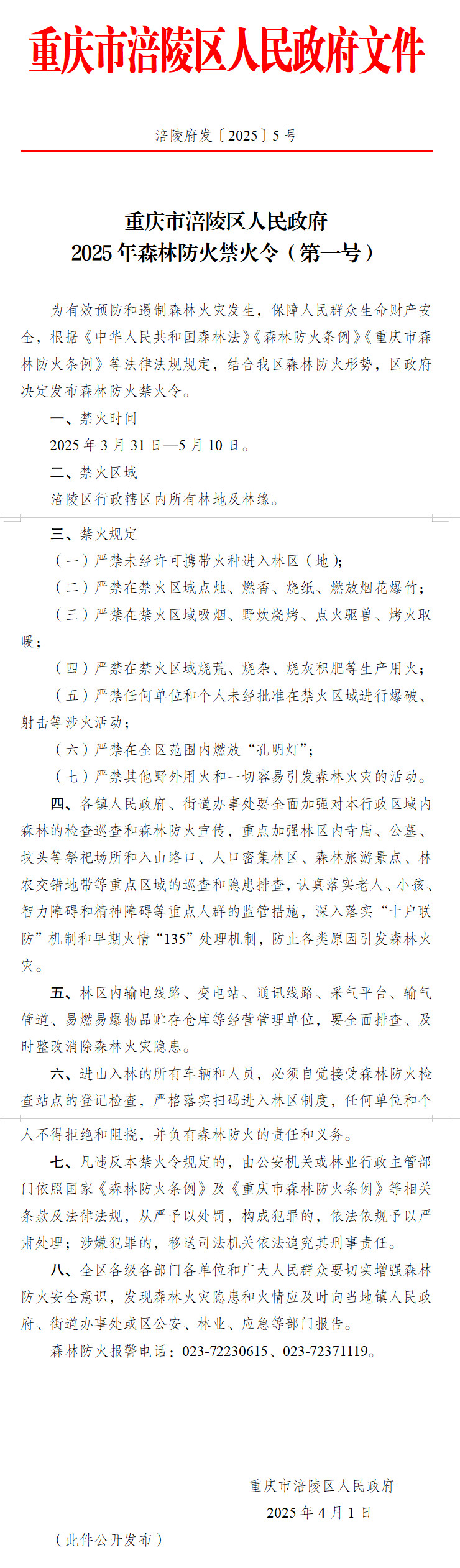 重庆市涪陵区人民政府 2025年森林防火禁火令(第一号)
