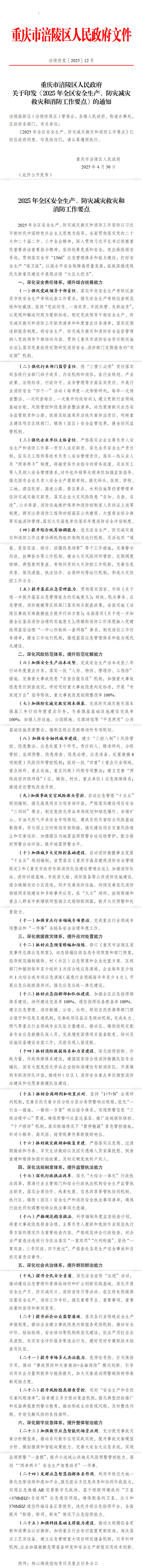 重庆市涪陵区人民政府 关于印发《2025年全区安全生产、防灾减灾 救灾和消防工作要点》的通知