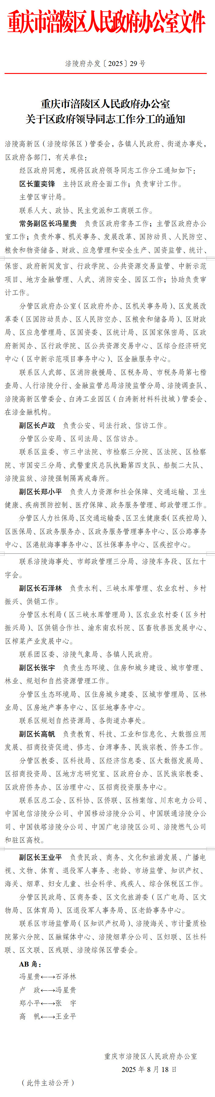 重庆市涪陵区人民政府办公室 关于区政府领导同志工作分工的通知