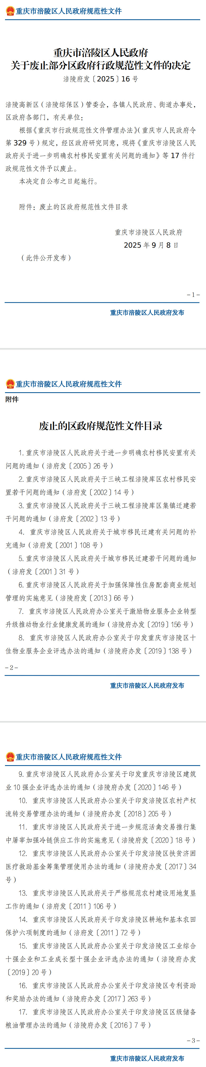 重庆市涪陵区人民政府 关于废止部分区政府行政规范性文件的决定