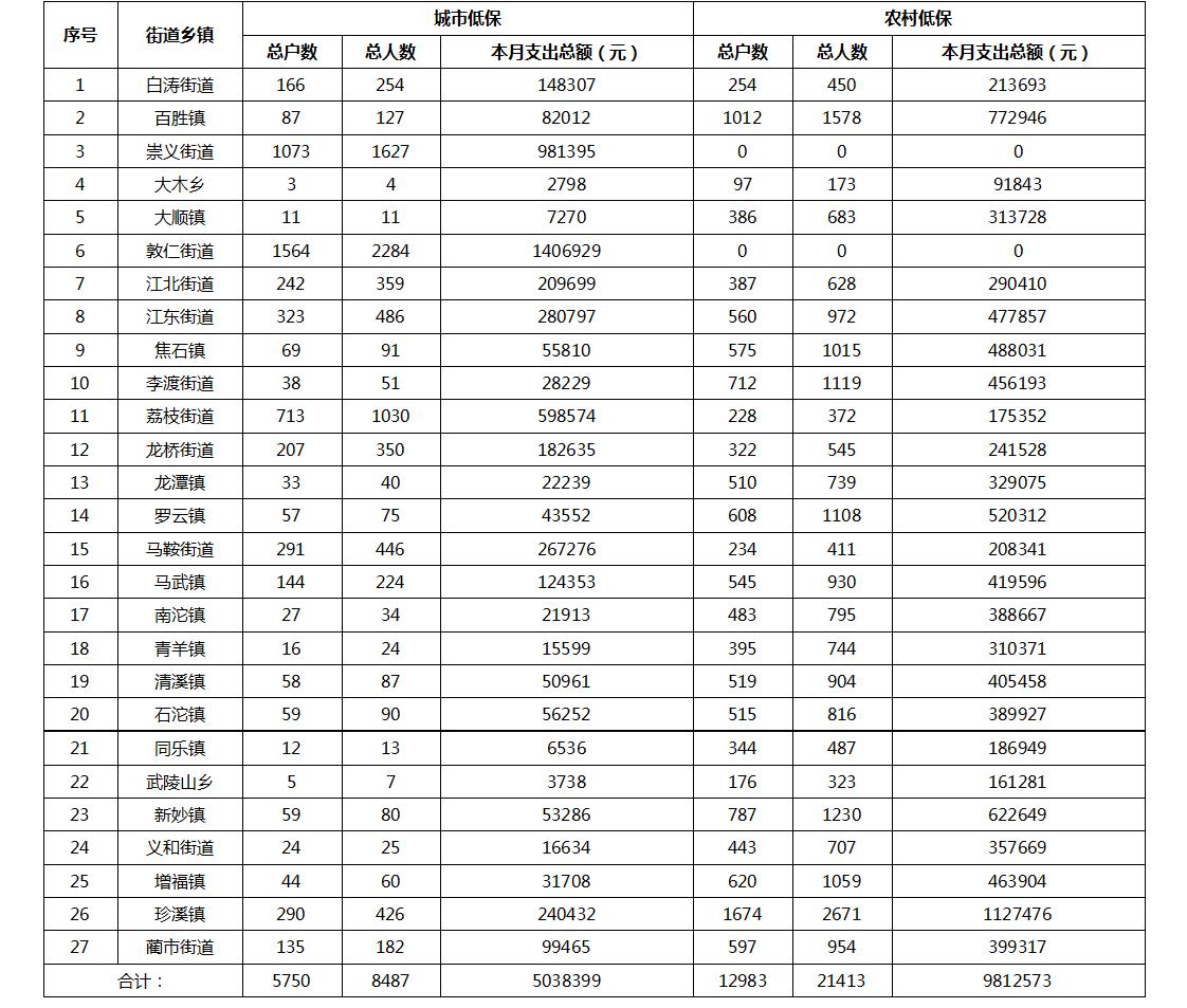 2023年1月涪陵区城乡居民最低生活保障金发放汇总表