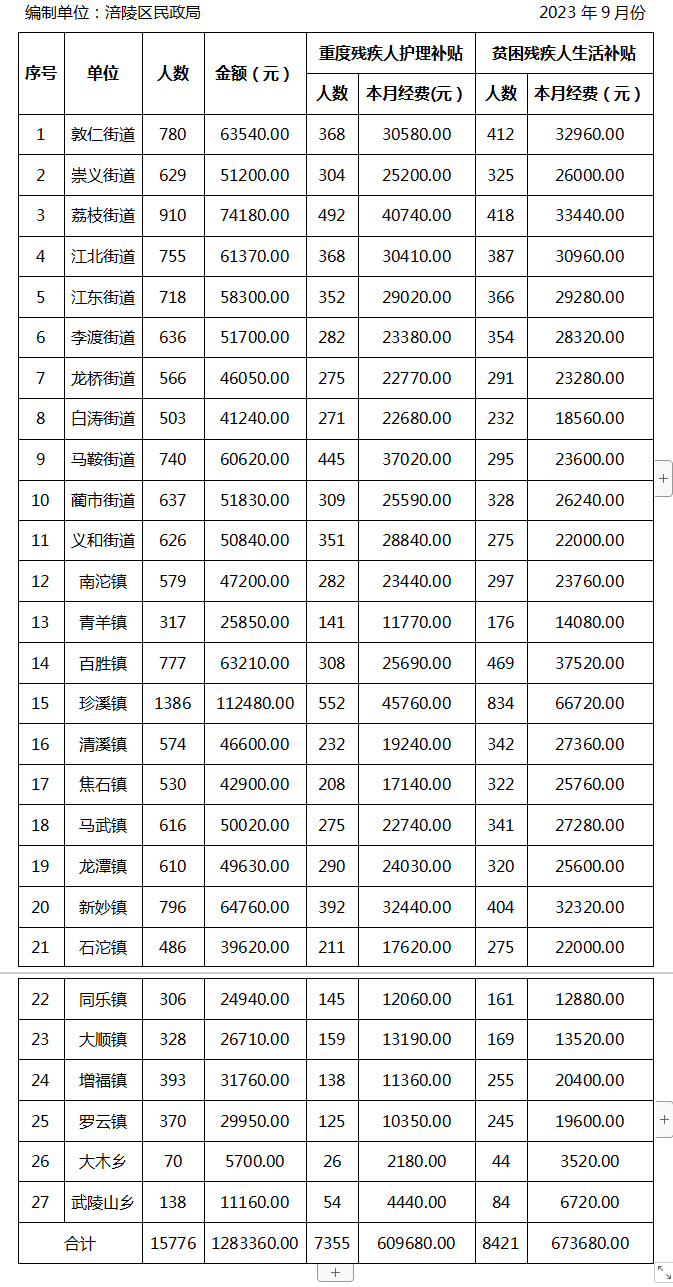 2023年9月涪陵区残疾人两项补贴发放汇总表