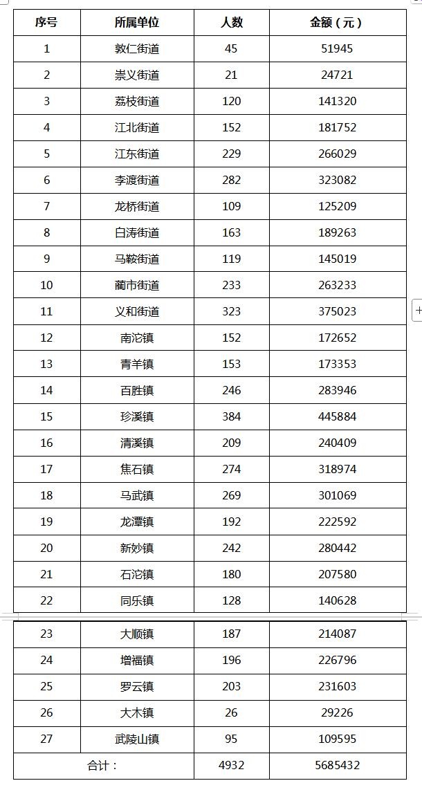 2025年8月涪陵区特困人员救助供养补贴发放汇总表
