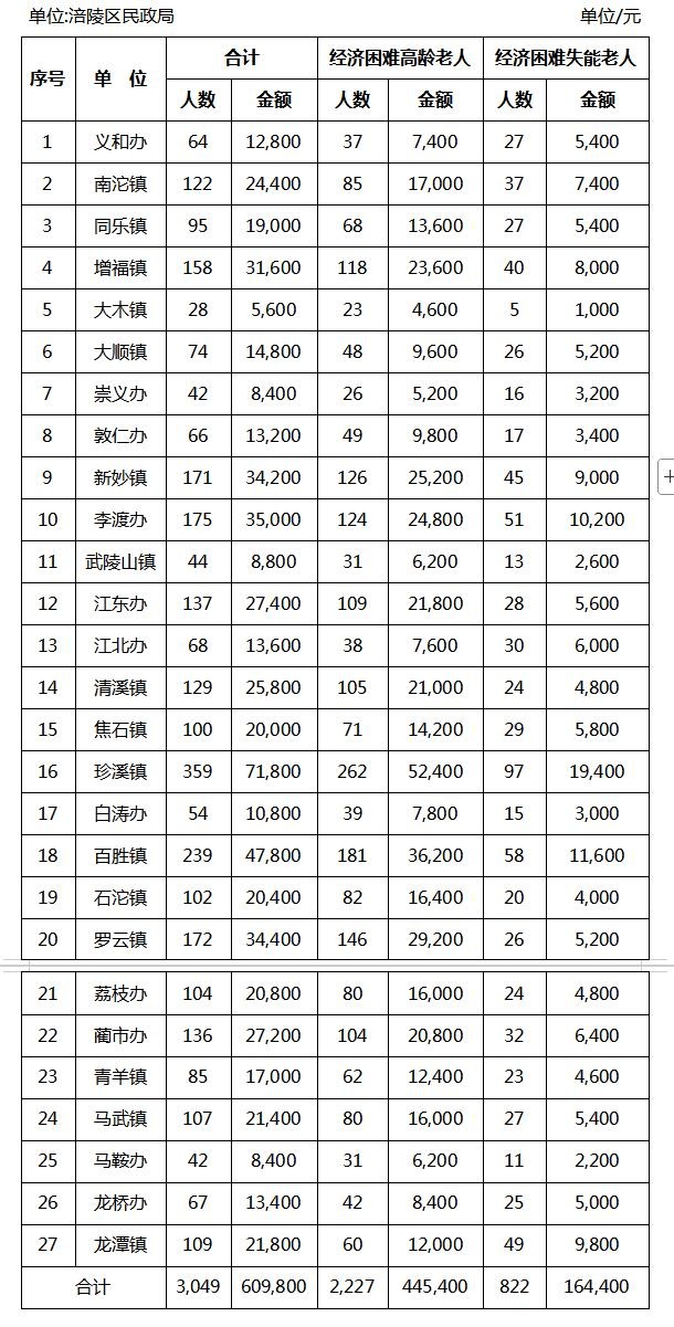 2025年10月涪陵区经济困难高龄失能老人养老服务补贴发放汇总表