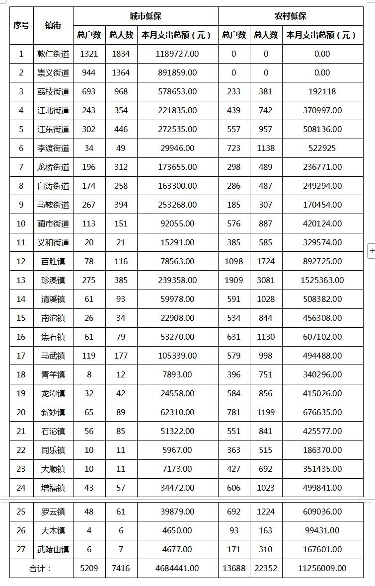 2025年10月涪陵区城乡居民最低生活保障金发放汇总表