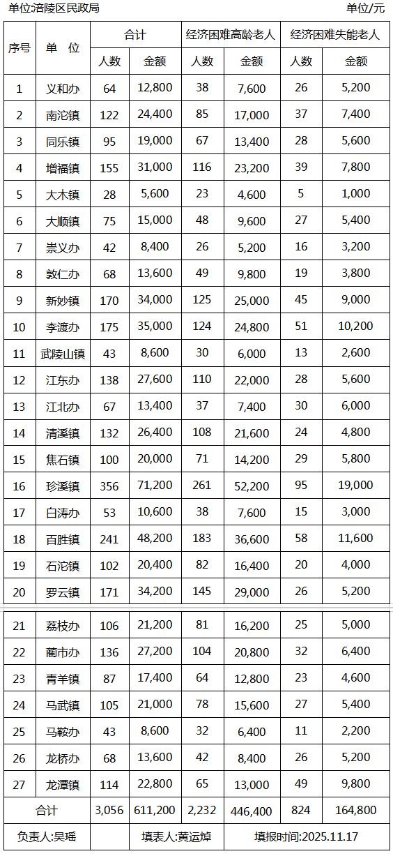 2025年11月涪陵区经济困难高龄失能老人养老服务补贴发放汇总表