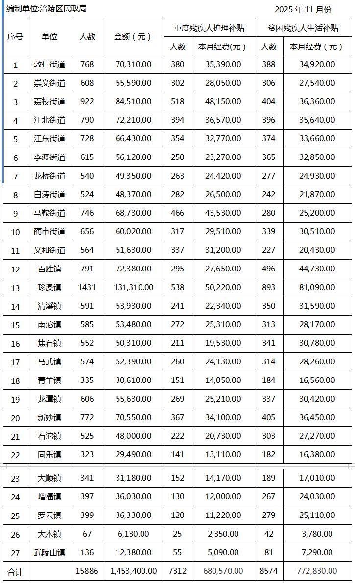 2025年11月涪陵区残疾人两项补贴发放汇总表