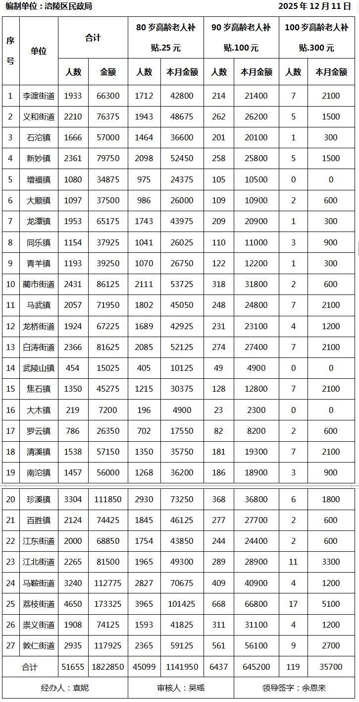 2025年12月涪陵区高龄津贴发放汇总表