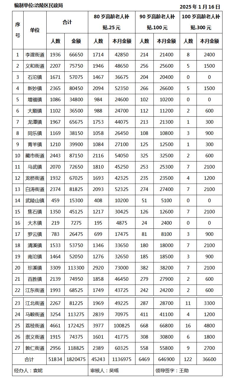 2026年1月涪陵区高龄津贴发放汇总表
