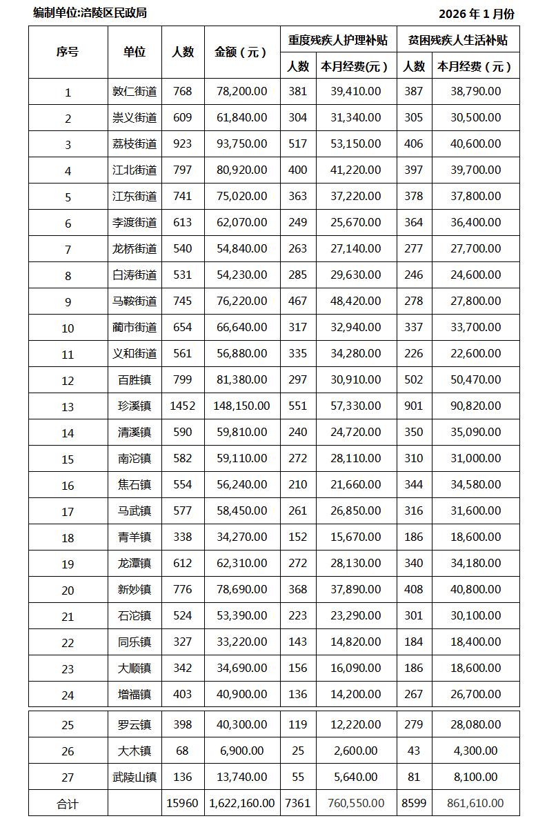 2026年1月残疾人两项补贴财政直补汇总表