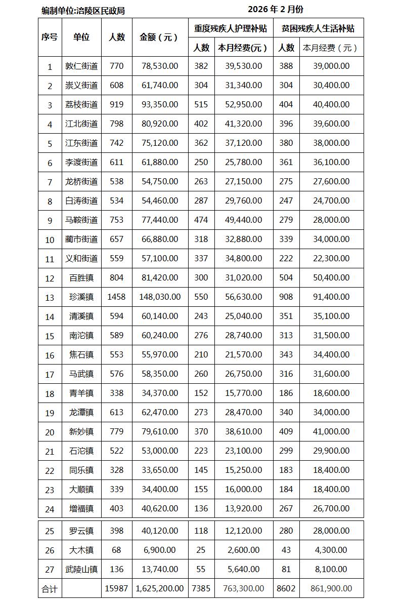 2026年2月残疾人两项补贴财政直补汇总表