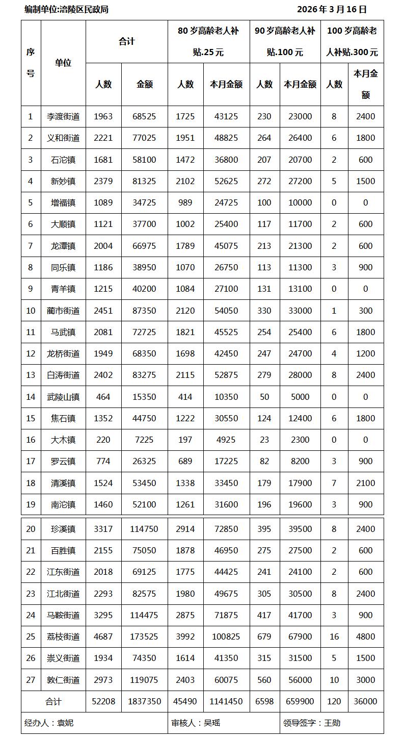 重庆市涪陵区2026年3月高龄津贴汇总表