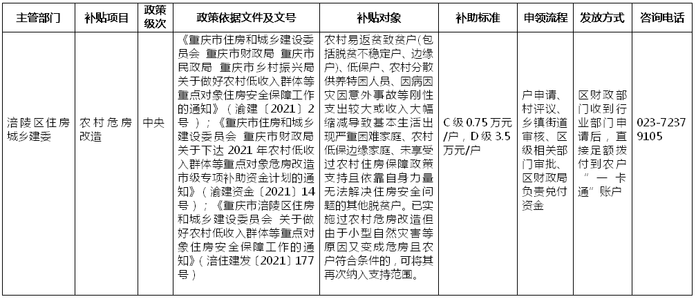 重庆市涪陵区住房和城乡建设委员会惠民惠农“一卡通”项目补贴政策清单(2022年)