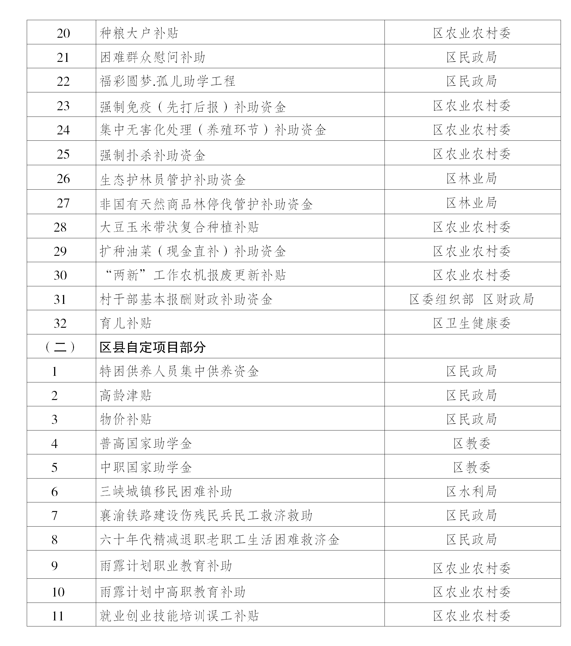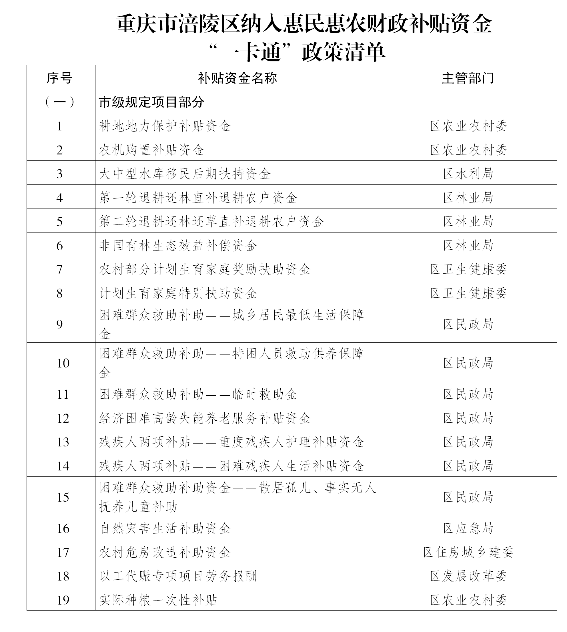 重庆市涪陵区纳入惠民惠农财政补贴资金 “一卡通”政策清单
