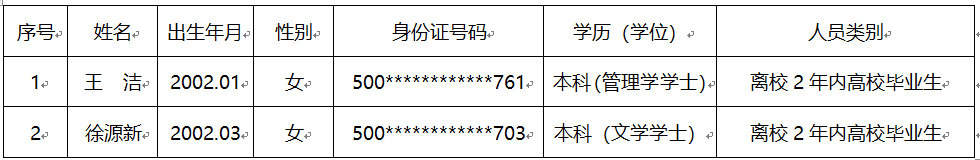 根据公益性岗位开发管理相关要求及《重庆市涪陵区社会保险事务中心关于招聘公益性岗位的公告》,经报名、资格审查、面试、体检等环节,现对拟聘的2名公益性岗位人员基本情况公示如下: