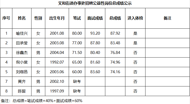 根据工作要求,现将义和街道招聘公益性岗位总成绩公示如下: