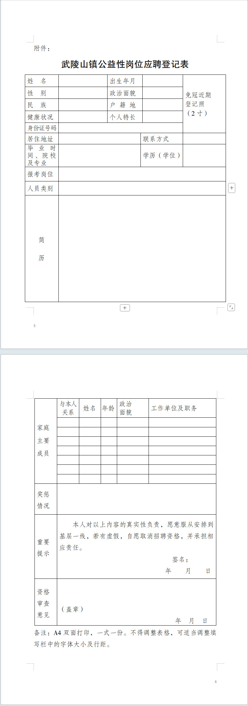 附件:武陵山镇公益性岗位报名登记表