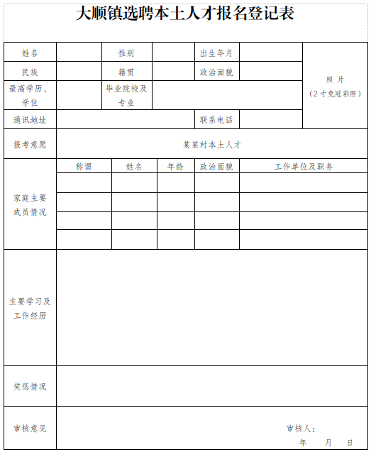 附件:《大顺镇选聘本土人才报名登记表》