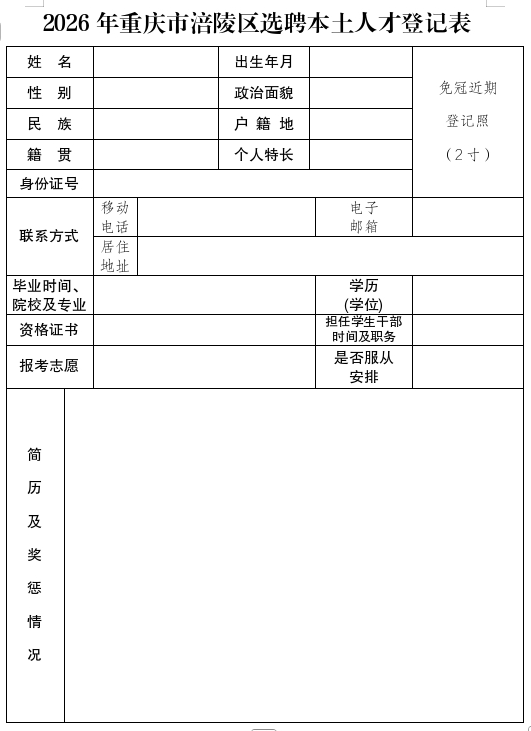 附件:2026年重庆市涪陵区选聘本土人才登记表