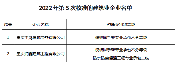 附件:2022年第5次核准的建筑业企业名单