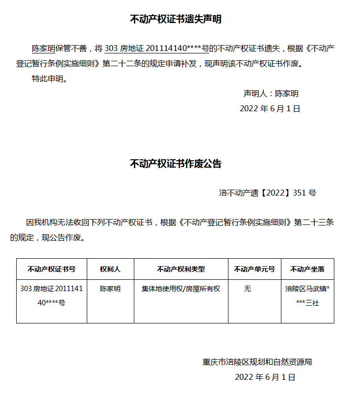 陈家明遗失声明与作废公告 涪不动产遗【2022】351号