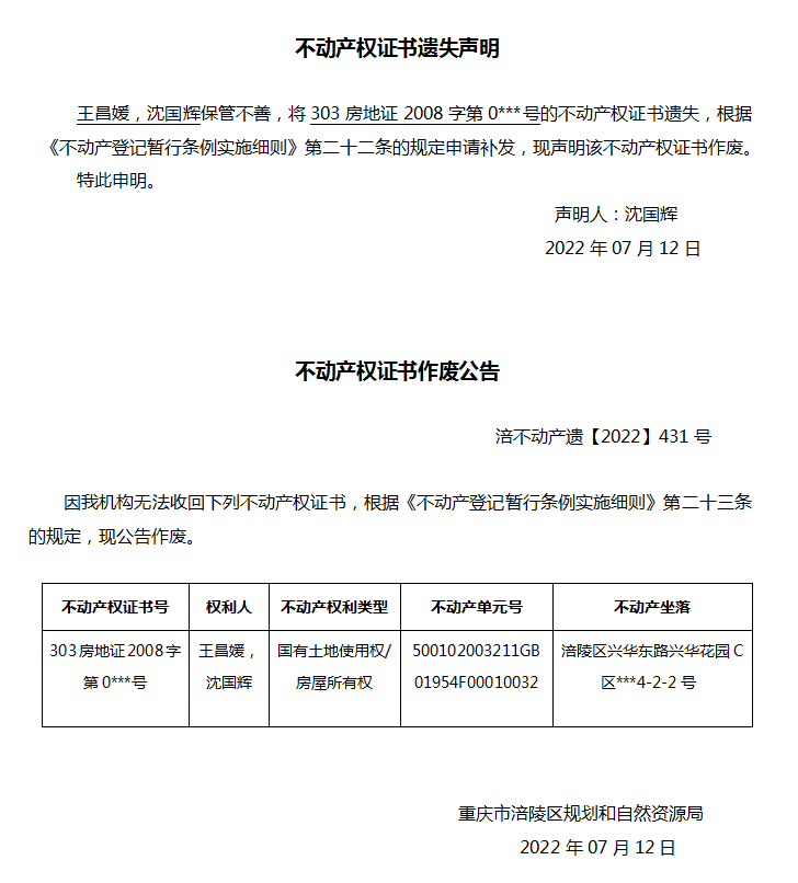 王昌媛,沈国辉遗失声明与作废公告 涪不动产遗【2022】431号