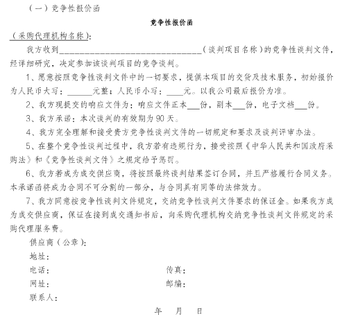 (一)供应商必须在响应文件中对以上条款和服务承诺明确列出,承诺内容必须达到本篇及竞争性谈判其他条款的要求。