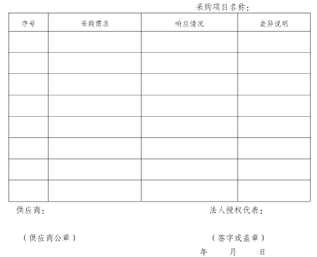 5. 若“响应情况”栏中仅填写“无偏离”或“有偏离”等内容而未作实质性参数描述,该供应商将失去成为成交供应商的资格,仅保留其合格供应商的身份。