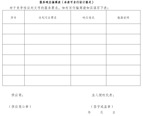 2. 该表必须按照竞争性谈判要求逐条如实填写,根据响应情况在“差异说明”项填写正偏离或负偏离及原因,完全符合的填写“无差异”;