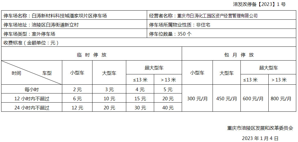 停车场收费备案表(白涛新材料科技城潘家坝片区停车场)