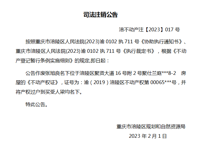张旭良司法注销公告 涪不动产注【2023】017号