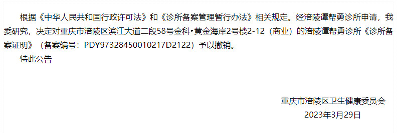 重庆市涪陵区卫生健康委员会关于撤销涪陵谭帮勇诊所《诊所备案证明》的公告