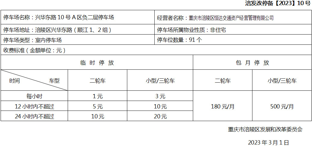 停车场收费备案表(兴华东路10号A区负二层停车场)