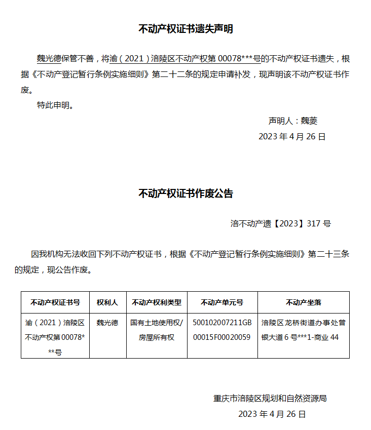 魏光德遗失声明与作废公告 涪不动产遗【2023】317号