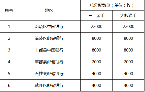 表1:涪陵辖区三江源币、大熊猫币预约发行分配数量