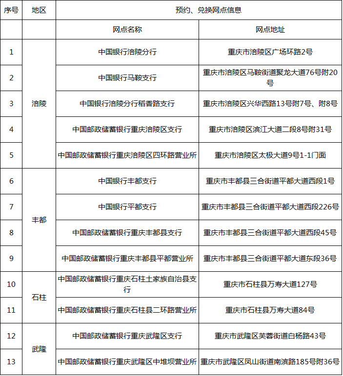 此次发行采取预约发行方式,涪陵辖区由中国银行和中国邮政储蓄银行共同承担预约兑换工作,并于2023年8月22日22时至8月24日24时,以组为单位办理预约登记业务,每组包含三江源币和大熊猫币各1枚,每人预约、兑换限额为20组,预约、兑换的有效身份证件必须为第二代身份证原件。由于第二代居民身份证原件遗失、未成年未办理第二代居民身份证等原因,无法出具第二代居民身份证原件的,可以使用户口簿、临时居民身份证办理。各预约网点情况详见表2。