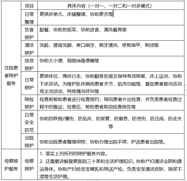 (二)陪护服务主要内容(包括但不限于表中所列)
