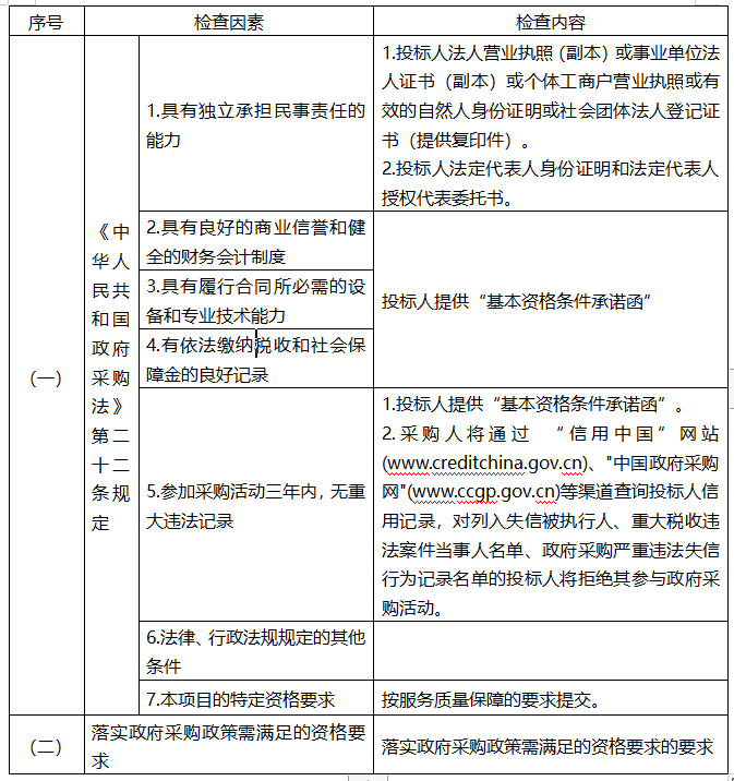 依据政府采购相关法律法规规定,由采购人对投标文件中的资格证明文件进行审查。资格审查资料表如下: