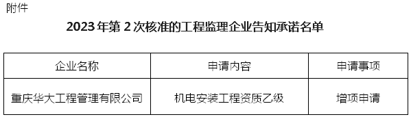 根据《工程监理企业资质管理规定》(建设部令第158号),《关于全面实行工程监理企业资质告知承诺制审批的通知》(渝建管〔2023〕141号)等有关规定,重庆华大工程管理有限公司以告知承诺方式申请工程监理企业资质,现将核准的企业名单进行公布。