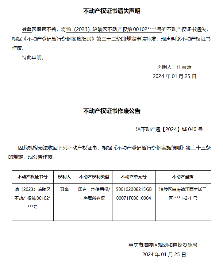 聂鑫遗失声明与作废公告 涪不动产遗【2024】城040号
