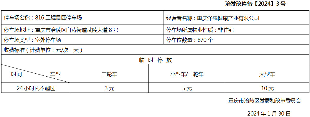 停车场收费备案表(816工程景区停车场 )