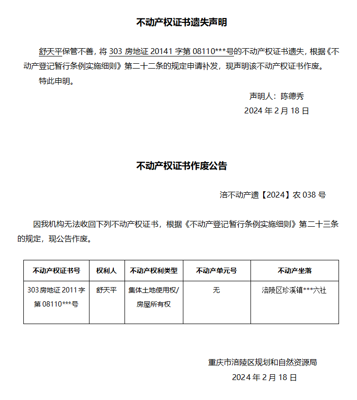 舒天平遗失声明与作废公告 涪不动产遗【2024】农038号