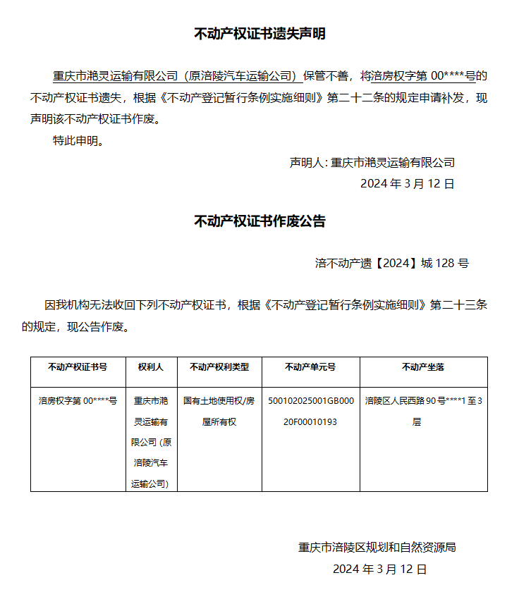 重庆市滟灵运输有限公司遗失声明与作废公告 涪不动产遗【2024】城128号