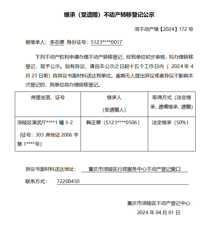 李志德继承公告 涪不动产继【2024】172号