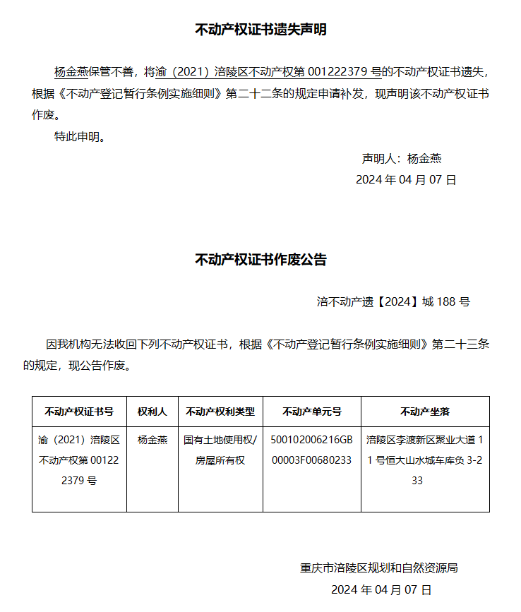 杨金燕遗失声明与作废公告 涪不动产遗【2024】城188号