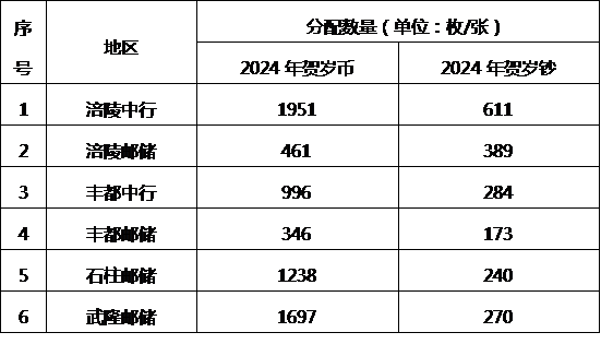 表1:涪陵辖区2024年贺岁币、2024年贺岁钞余量兑换分配数量