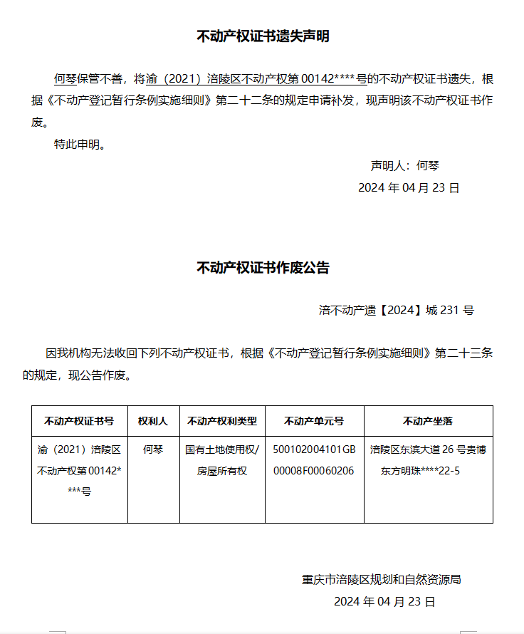 何琴遗失声明与作废公告 涪不动产遗【2024】城231号