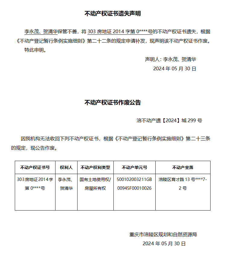 李永茂、贺清华遗失声明与作废公告 涪不动产遗【2024】城299号