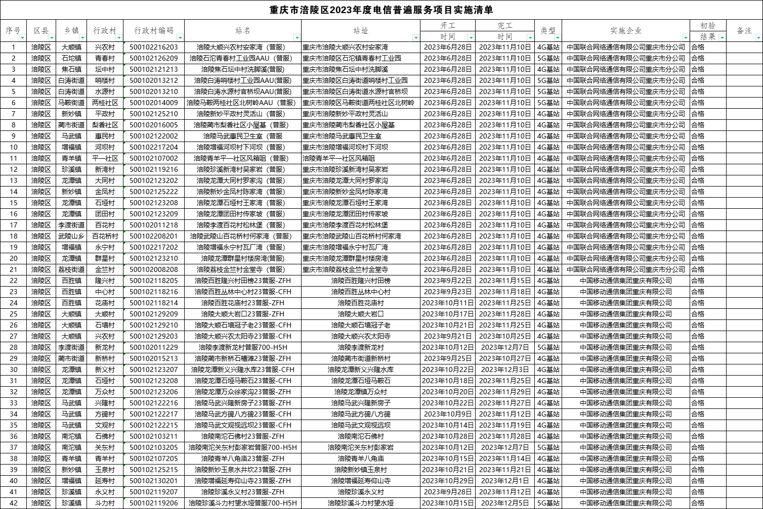 根据《工业和信息化部办公厅关于2023年度电信普遍服务项目的复函》(工厅通信函〔2022〕306号)、《财政部关于提前下达2023年电信普遍服务补助资金预算的通知》(财建〔2022〕381号),我区纳入重庆市2023年度电信普遍服务覆盖项目(招标项目编码TC229D197)实施范围,支持行政村开展基站建设。经市通信管理局公开招标投标等程序,我区由中国移动涪陵分公司、中国联通涪陵分公司在花庙村、隆兴村等40个行政村建设42个基站。