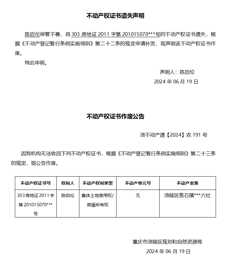 陈启伦遗失声明与作废公告 涪不动产遗【2024】农191号
